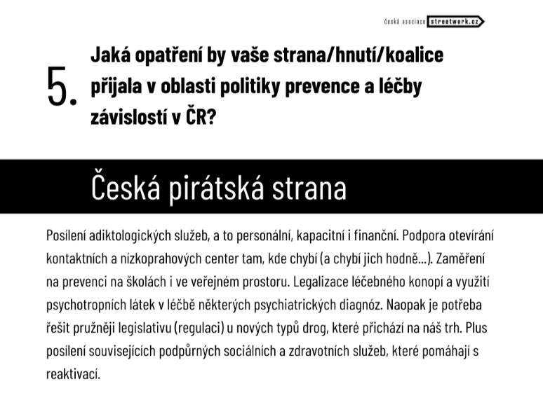 Z volebního programu Pirátů: strana ve svém volebním programu cílí na posílení prevence a financování preventivních programů a podporu adiktologů. Chtějí zlepšit dostupnost péče o duševní zdraví, například zvýšením počtu Center duševního zdraví. Rovněž v programu uvádí výběr daní z nových zdrojů, mimo jiné z regulace konopí.