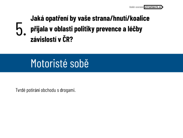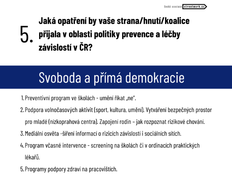 Druhá část předvolební ankety ČAS byla věnovaná oblasti politiky prevence a léčby závislostí, a také dekriminalizaci užívání návykových látek. Zveřejňujeme odpovědi politických subjektů, které se ve volebních průzkumech pohybují nad 3 procenty.