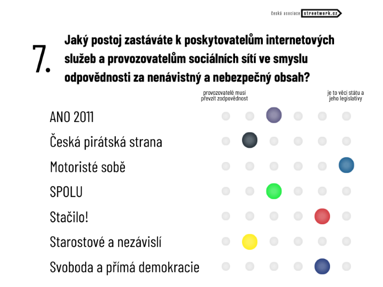 Pozoruhodný je i postoj jednotlivých kandidujících subjektů k poskytovatelům internetových služeb a provozovatelům sociálních sítí ve smyslu odpovědnosti za nenávistný a nebezpečný obsah, kde lze sledovat značné rozdíly. Ptali jsme se mimo jiné, zda provozovatelé musí převzít zodpovědnost za obsah, nebo je to naopak věcí státu a jeho legislativy. Na stranu zodpovědnosti provozovatelů se kloní Piráti a STAN, blíže ke středu je poté SPOLU a ANO. Naopak zodpovědnost státu v této otázce požadují SPD, Motoristé sobě a Stačilo!