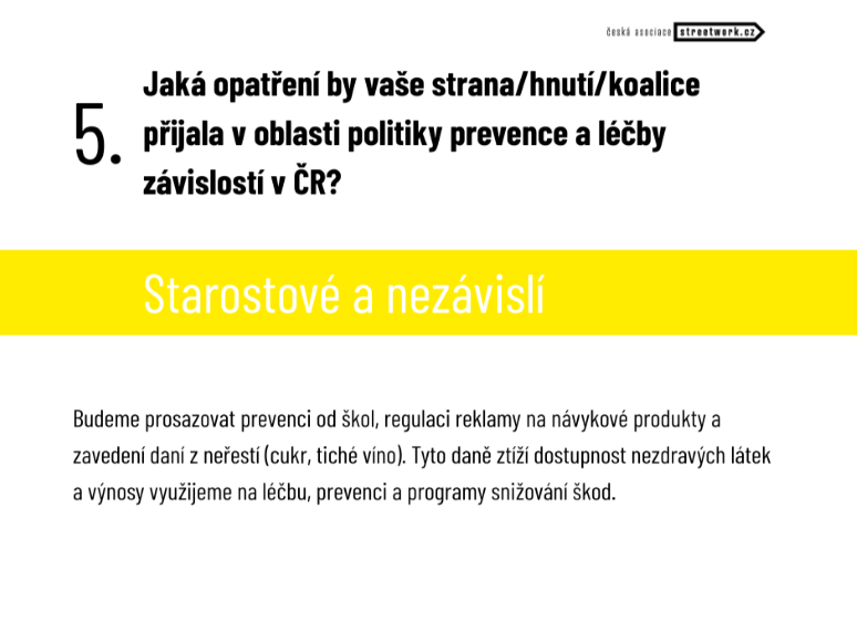 Z volebního programu STAN: ve svém programu hnutí prosazuje navýšení finančních prostředků do adiktologických služeb. Také zamýšlí zavést kombinaci omezení, zákazů a pozitivní motivace v souladu s principy snižování škod spojených s návykovým chováním (harm reduction policy) a tento přístup chce aplikovat na všechny aspekty politiky závislostí. Dále plánuje rozšířit síť ambulantních protialkoholních služeb a navrhuje také omezení prodeje energetických nápojů dětem a mladistvým spolu spolu se zavedením daně ze slazených nápojů.