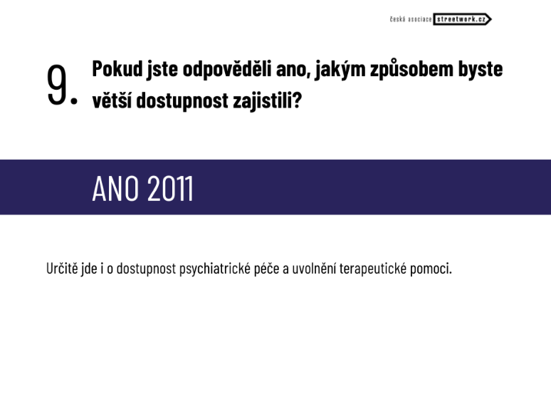 ANO 2011 ve svém volebním programu uvádí: hnutí chce obnovit reformu péče o duševní zdraví, dále sází na rozvoj komunitních služeb s cílem zvýšení její dostupnosti a kvality u všech cílových skupin, zejména dětí a adolescentů. Zaměří se na zvýšení dostupnosti psychoterapie a péče u psychiatrů. Dále podpoří zvyšování psychické odolnosti u obyvatel a funkční síť krizových služeb a akutní lůžkové péče. ANO 2011 také chce pracovat na odbourávání stigmatizace a podpoře lidí se zkušeností s duševním onemocněním při jejich návratu do běžného života a zapojování do systému péče o duševní zdraví. Pro děti a mladé lidi hnutí požaduje zvýšení dostupnosti školních psychologů.