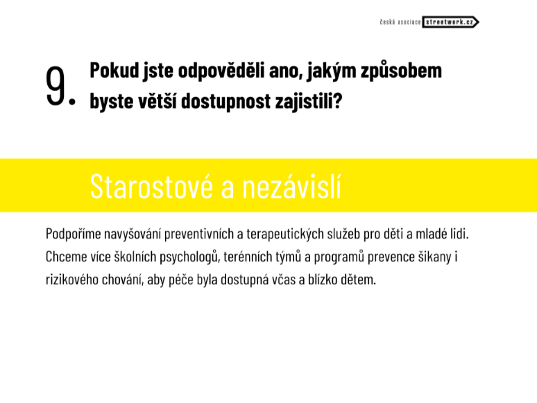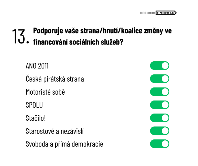 Větší participaci krajů či obcí ve financování sociálních služeb v anketě zmiňují ANO, SPOLU a STAN. Rozdílný přístup zvolili Motoristé sobě, kteří plánují, aby peníze putovaly přímo klientovi. Ten by se pak sám rozhodl, jakou službu si zvolí a u jakého poskytovatele.
