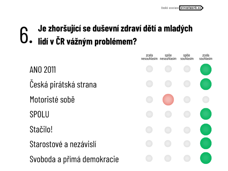 Ve třetí části předvolební ankety ČAS jsme se zaměřili na oblast duševního zdraví dětí a mladých lidí a na problémy, kterým v dnešní době čelí. Zhoršující se duševní zdraví považuje za závažný problém šest ze sedmi politických subjektů, pouze Motoristé sobě jej označují za spíše nezávažný. Ti jako jediní také nepodporují navyšování preventivních a terapeutických služeb pro děti a mladé lidi v oblasti duševního zdraví.