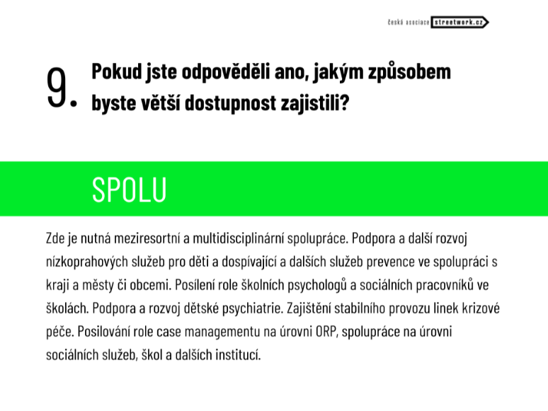 STAN ve svém volební programu uvádí: hnutí plánuje rozšíření mobilních týmů poskytující terénní služby v oblasti duševního zdraví, které budou schopny reagovat na urgentní potřeby dětí a rodin přímo v jejich přirozeném prostředí. Dále se chce zaměřit na posílení kapacity krizových a asistenčních linek nebo také začlenění vzdělávání o duševním zdraví do školních osnov. V neposlední řadě hnutí plánuje zajistit financování veřejných služeb v oblasti péče o duševní zdraví v rámci státního rozpočtu a podpořit vznik a provoz nízkoprahových center nabízejících anonymní a bezplatnou pomoc. Školám by měli být podle programu poskytnuté finanční prostředky potřebné k zajištění školních psychologů.