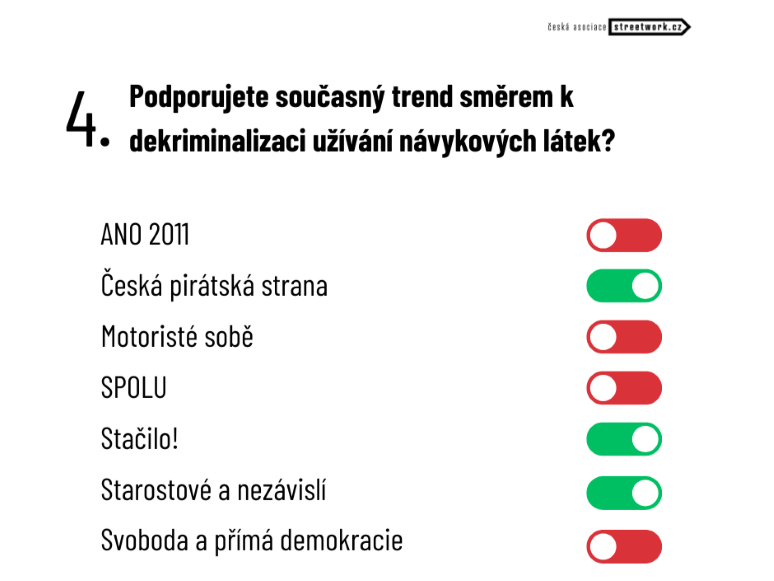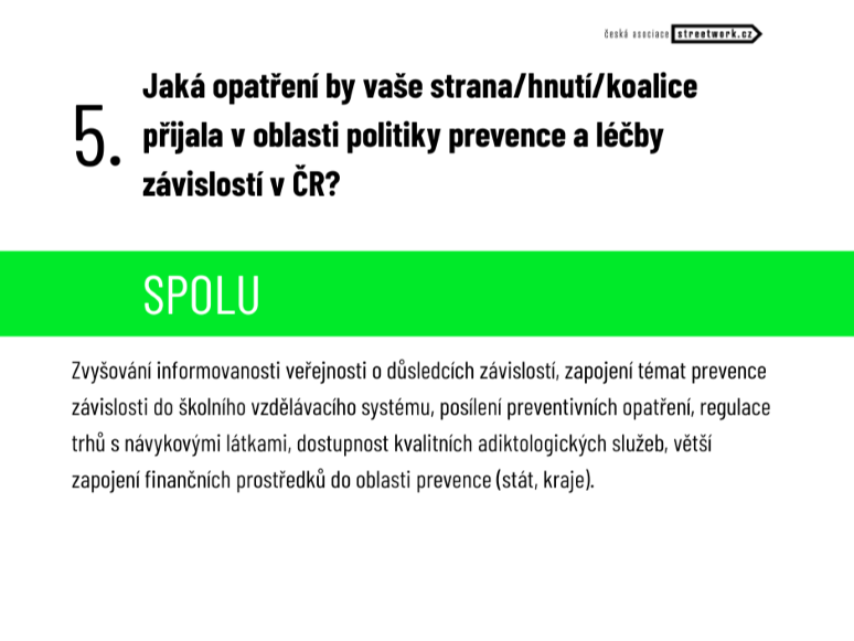 Druhá část předvolební ankety ČAS byla věnovaná oblasti politiky prevence a léčby závislostí, a také dekriminalizaci užívání návykových látek. Zveřejňujeme odpovědi politických subjektů, které se ve volebních průzkumech pohybují nad 3 procenty.