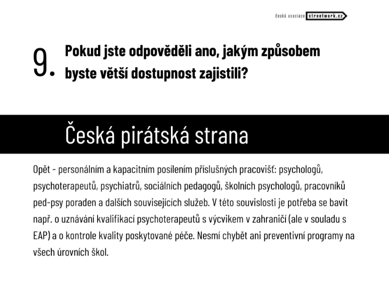 Piráti ve svém volebním programu uvádí: strana požaduje zlepšení dostupnosti péče o duševní zdraví zvýšením počtu Center duševního zdraví. Dále chce posílit prevenci v této oblasti i za využití terapeutů, kteří doplní psychology a psychiatry. Posílí práva pacientů a jejich svobodné volby v celém zdravotním systému, včetně uplatňování alternativních léčiv (např. psychedelik).