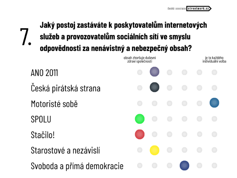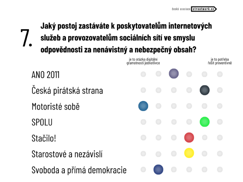 Pozoruhodný je i postoj jednotlivých kandidujících subjektů k poskytovatelům internetových služeb a provozovatelům sociálních sítí ve smyslu odpovědnosti za nenávistný a nebezpečný obsah, kde lze sledovat značné rozdíly. Ptali jsme se mimo jiné, zda provozovatelé musí převzít zodpovědnost za obsah, nebo je to naopak věcí státu a jeho legislativy. Na stranu zodpovědnosti provozovatelů se kloní Piráti a STAN, blíže ke středu je poté SPOLU a ANO. Naopak zodpovědnost státu v této otázce požadují SPD, Motoristé sobě a Stačilo!