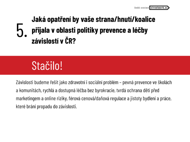 Z volebního programu Stačilo!: hnutí požaduje podpoření prevence v oblasti sociálně patologických jevů, zejména nejrůznějších forem závislostí.
