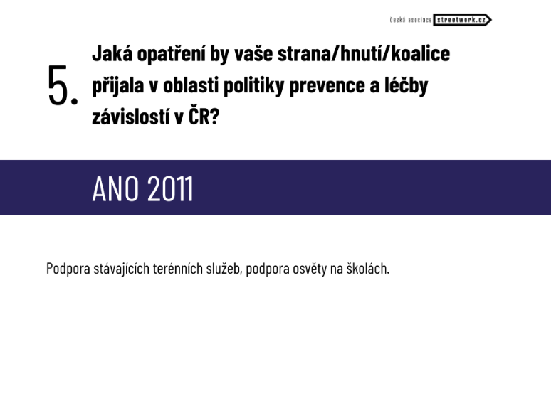 Z volebního programu ANO 2011: hnutí uvádí pouze obecnou podporu prevence a zdravého životního stylu, případně zlepšení prevence patologických jevů u dětí, a to závislosti na sociálních sítích a mobilech.